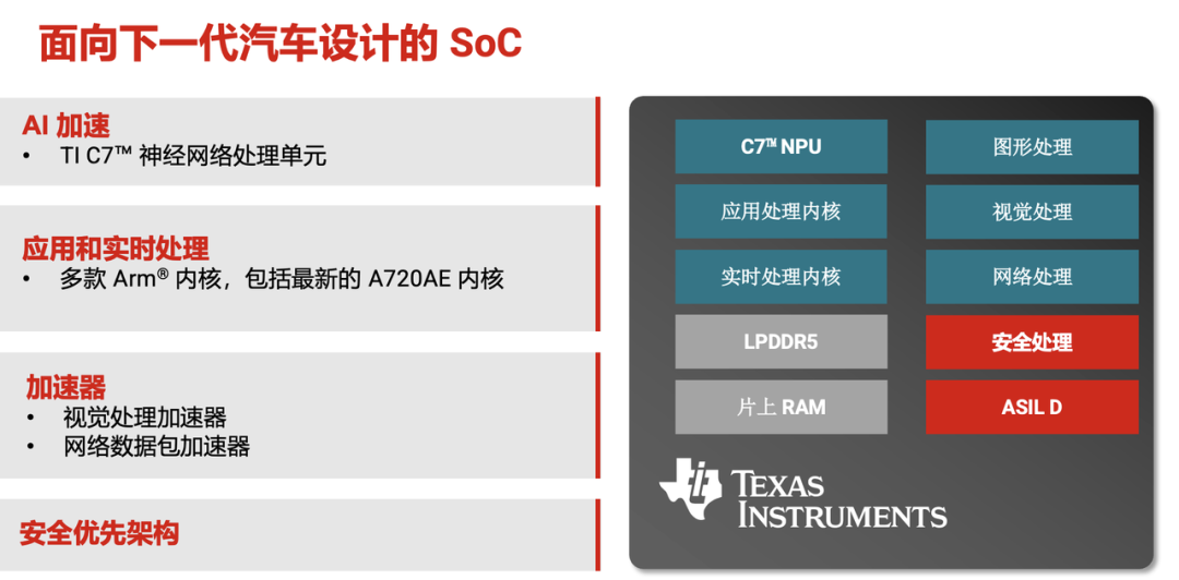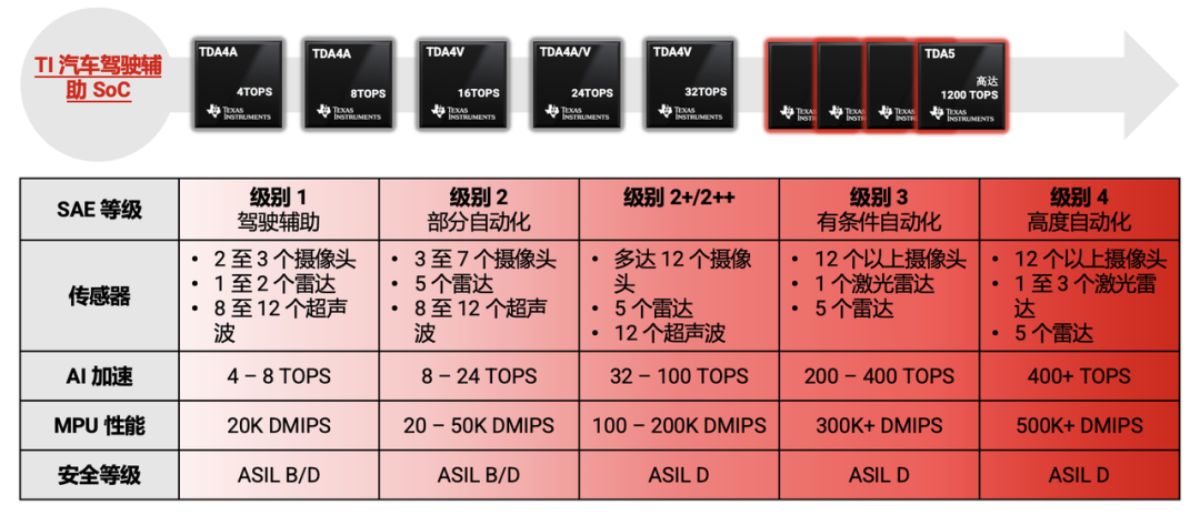 在计算层面,TI 的核心方案是 TDA5 高性能 SoC 系列,面向 L1 至 L3 全级别自动驾驶设计,强调功耗、安全与 AI 算力的协同优化,TDA5是通过增加TOPS来实现自己的跨越,毕竟TDA4V的算力不太够看。