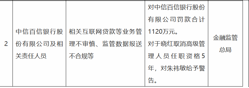 9月30日,金融监管总局行政处罚信息公开表显示,中信百信银行股份有限公司因相关互联网贷款等业务管理不审慎、监管数据报送不合规等被罚款合计1120万元。