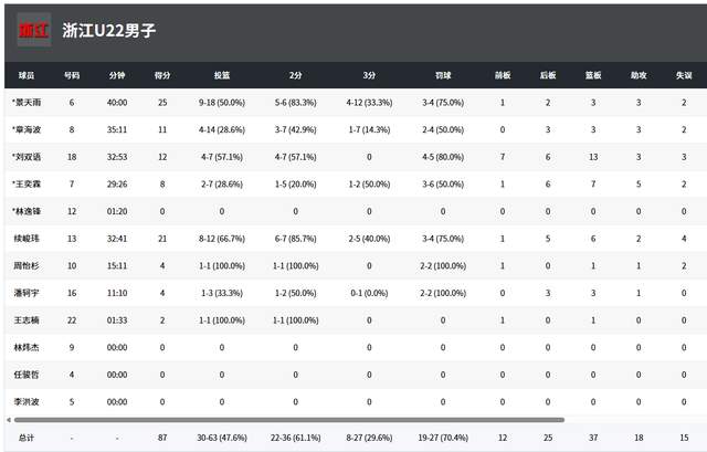 从数据来看,浙江队明显打得更加出色,全队4人得分上双,续峻玮21分6篮板,景天雨25分3篮板3助攻,刘双语12分13篮板,章海波11分。