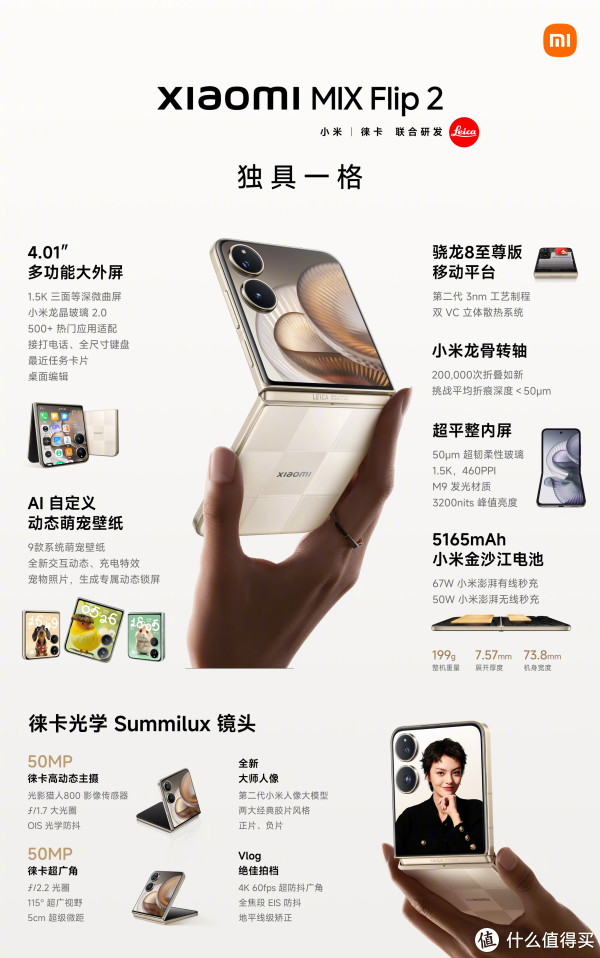 小米MIX Flip2前置3200万像素摄像头,后置5000万主摄(光影猎人800、F1.7、OIS)+5000万超广角微距(F2.2、115°、5cm超级微距)双摄组合,支持全新大师人像、折叠街拍和徕卡专业影像等等。视频方面更加出色,三颗镜头均支持4K60FPS视频录制,包括超广角镜头和前置摄像头,系统还内置了大师镜头包和徕卡原生双画质等等,还有曾经风靡一时的随身拍套装可供选择。
